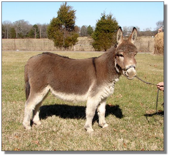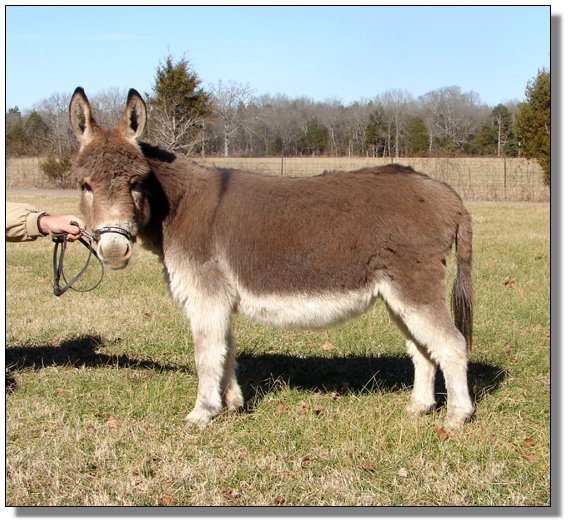 This little jennet was purchased from the on-line internet sale at The Labor Day Weekend Donkey Spectacular Sale on September 3rd, 2005, in partnership with Wit's End Farm. Later we bought the whole donkey for our own! She should be arriving on our farm soon. We will retake her photos and tell you more about her then. We are excited to add another jennet from 'Ass-Pirin Acres' and 'My World' bloodlines. Felina turned three years old in April and has been bred to our red jack, Windcrest Firefly, for a May 26th, 2007, foal.